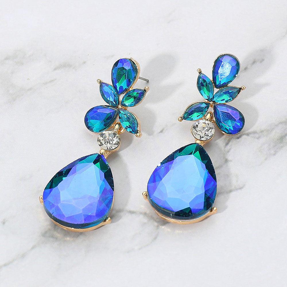 • Make a striking impression with these faceted teardrop statement earrings. Featuring bold, multi-cut stones arranged in a floral-inspired design, they capture light beautifully for a refined yet dramatic finish—perfect for evening wear or elevating any special occasion look.