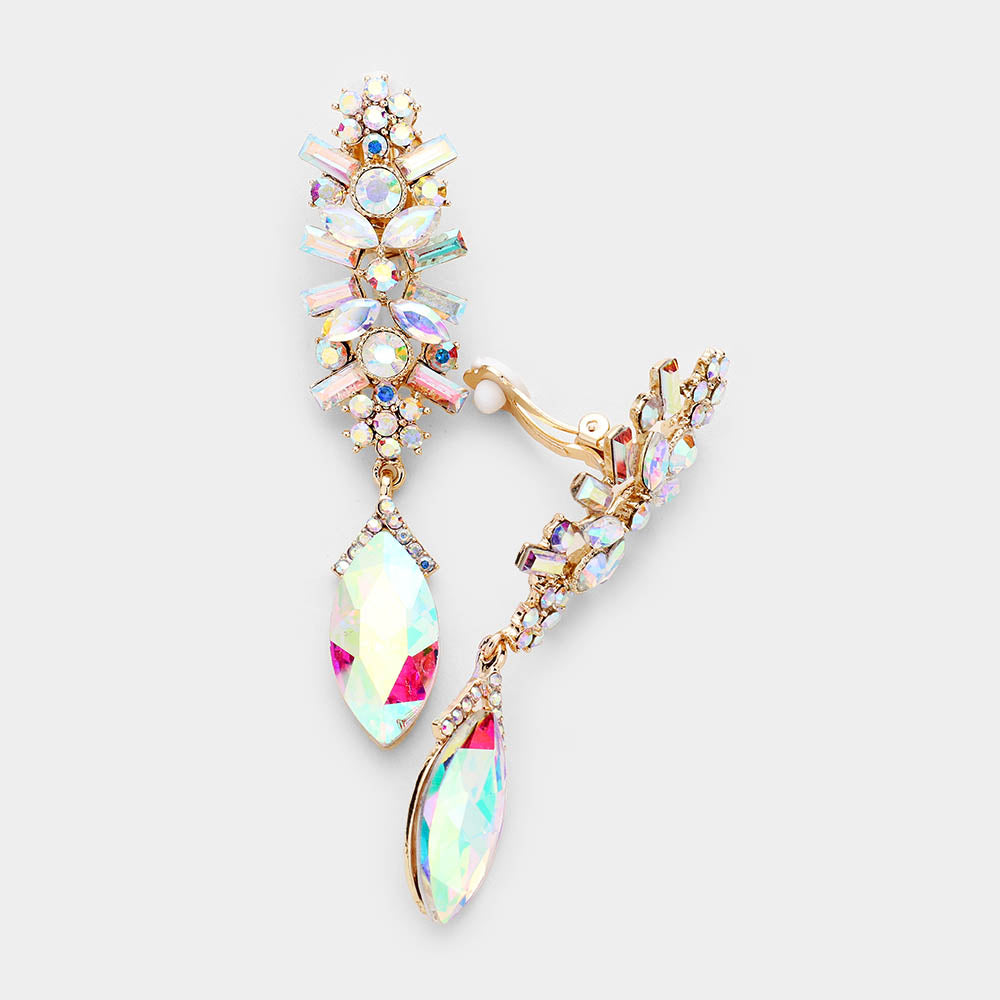 Slim AB Crystal Rhinestone Pave Clip On Pageant Earrings on Gold