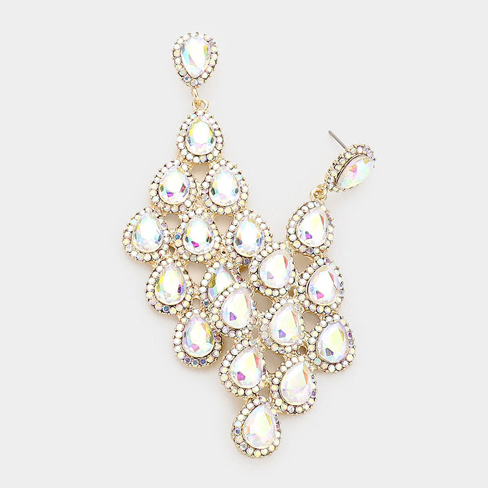 AB Rhinestone Trim and Teardrop Cluster Vine Pageant Earrings on Gold | Big Prom Earrings