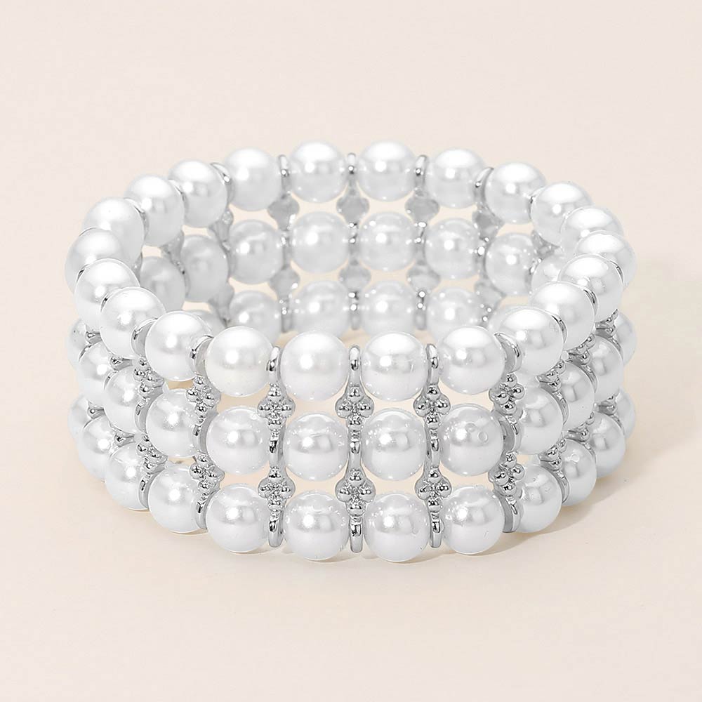 The cool silver spacer accents enhance the crisp white pearl glow, adding subtle contrast and refined shine. The stretch design provides flexible, slip-on comfort for effortless wear whether styled alone or stacked with coordinating bracelets.